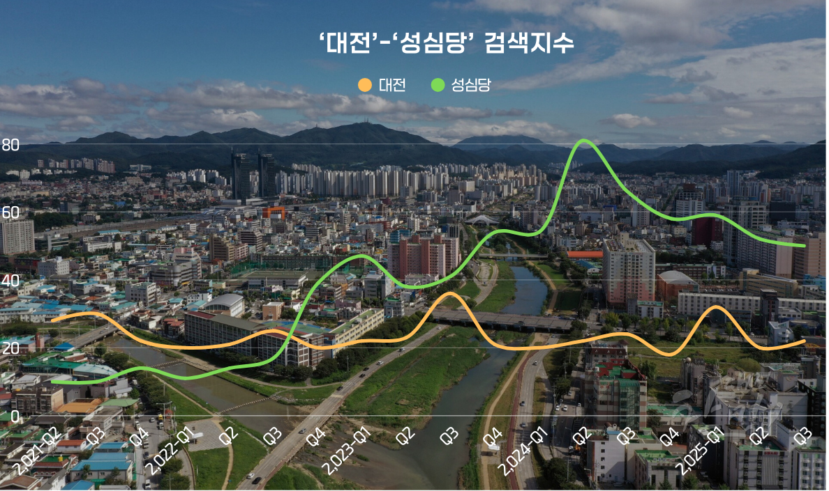네이버 데이터랩 검색어 트렌드를 보면, 대전의 도시와 브랜드 지형이 뒤집힌 순간이 포착된다. 2021년 초반까지만 해도 '대전' 검색량은 '성심당'보다 약 2배가량 높게 형성되어 있었다. 이는 지극히 정상적인 패턴이었다. 그러나 2022년 하반기부터 심상치 않은 조짐이 보이기 시작했다. 성심당의 검색량이 가파르게 상승하며 대전과의 격차를 좁히더니, 마침내 2022년 3분기를 기점으로 '성심당'이 '대전'을 완전히 추월하는 '골든 크로스'가 발생했다.