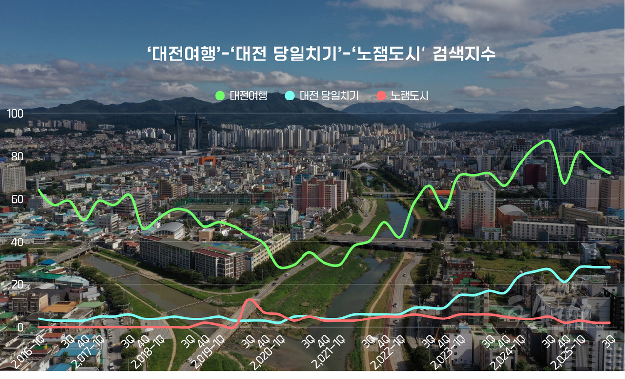 대전이 갑자기 재미있는 도시로 환골탈태한 것일까, 아니면 '빵을 사는 행위'가 여행의 재미를 대체한 것일까? 흥미롭게도 '성심당'의 검색지수가 폭발적으로 상승하는 시기와 맞물려, 대전의 오랜 오명이었던 '노잼 도시' 관련 선입견은 힘을 잃기 시작했다. 대신 그 자리를 '대전당일치기', '빵지순례', '딸기시루' 같은 검색어들이 채웠다.