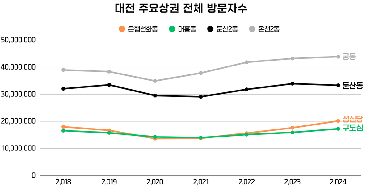 온라인상의 뜨거운 검색 열기와 성심당 본점 앞의 인산인해를 보면, 대전 중구의 은행선화동과 대흥동이 지난 수년간 대전에서 가장 붐비는 핫플레이스였던 것처럼 느껴진다. 성심당 앞의 긴 줄을 보면 대전의 중심이 온통 중구로 쏠린 것 같지만, 2018년부터 2024년까지의 전체 방문자 수를 보면 다른 흐름이 보인다. 방문자 수 총량에서는 둔산2동과 온천2동이 꾸준히 상위를 차지하고 있다. 이는 각 지역이 수행하는 도시 기능이 근본적으로 다르기 때문이다.