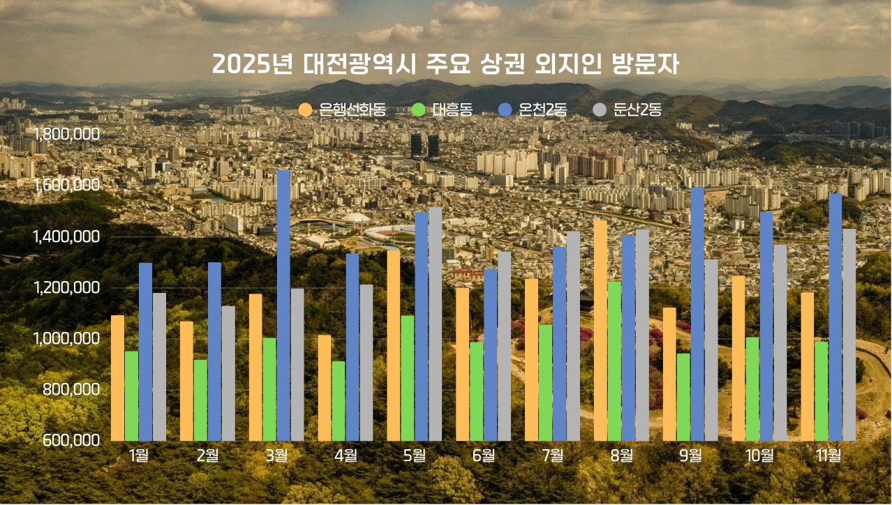 우리는 흔히 성심당이 있는 은행선화동 만이 대전의 유일한 활력소라고 믿기 쉽다. 그러나 데이터라는 렌즈를 통해 도시를 들여다보면, 우리가 알고 있던 '성심당의 도시' 프레임에는 의외의 균열이 발견된다. 이번 뉴스레터에서는 2025년 1월부터 11월까지의 최신 방문자 데이터를 바탕으로, 대전의 주요 상권들이 각기 어떤 욕망의 지도를 그리고 있는지 추적한다.