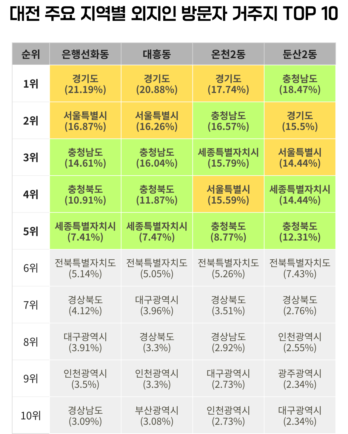 방문객의 총량보다 더 중요한 것은 '그들이 어디에서 왔는가?' 이다. 외지인의 거주지 데이터를 분석하면 각 상권이 누구의 '욕망'을 자극하고 있는지 더 명확해진다. 대전광역시 밖에 거주지를 둔 방문객들의 거주지를 살펴보자.