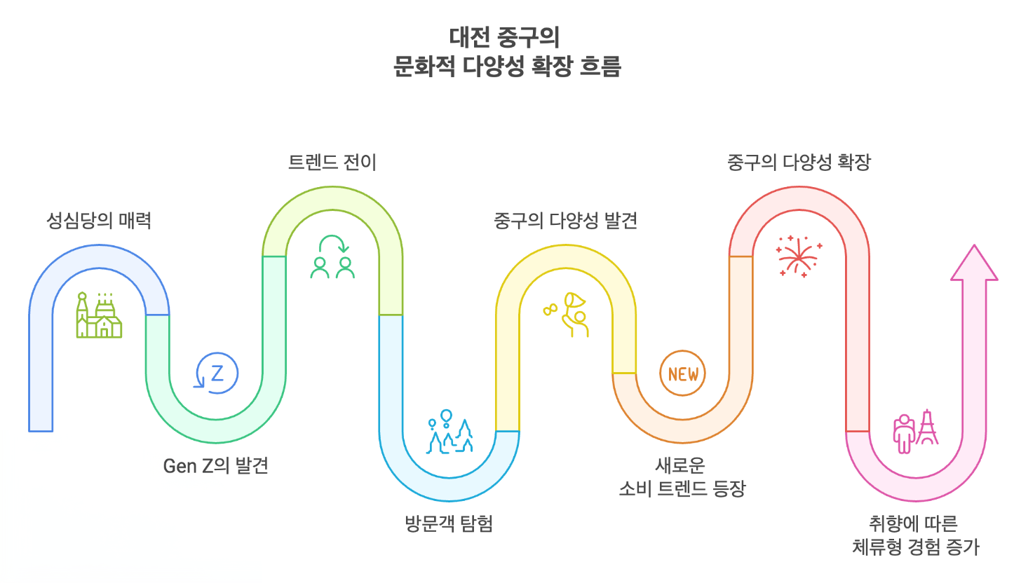 이러한 '트렌드 전이' 현상은 대전 중구가 단순한 빵집 거리를 넘어 '문화적 다양성'을 갖춘 상권으로 진화할 수 있는 기회를 제공한다. 이미 성심당의 도시로 불리고 있음에도 불구하고, 수많은 외지인이 둔산과 궁동의 매력을 동시에 즐기고 있다는 사실은 대전이라는 도시 자체가 가진 소비의 스펙트럼이 매우 넓다는 것을 방증한다. 중구 원도심 역시 성심당이라는 '트리거'를 통해 유입된 다양한 취향의 방문객들을 대전만의 고유한 시간적 깊이와 문화적 자산으로 매혹 시켜야 해야 한다.