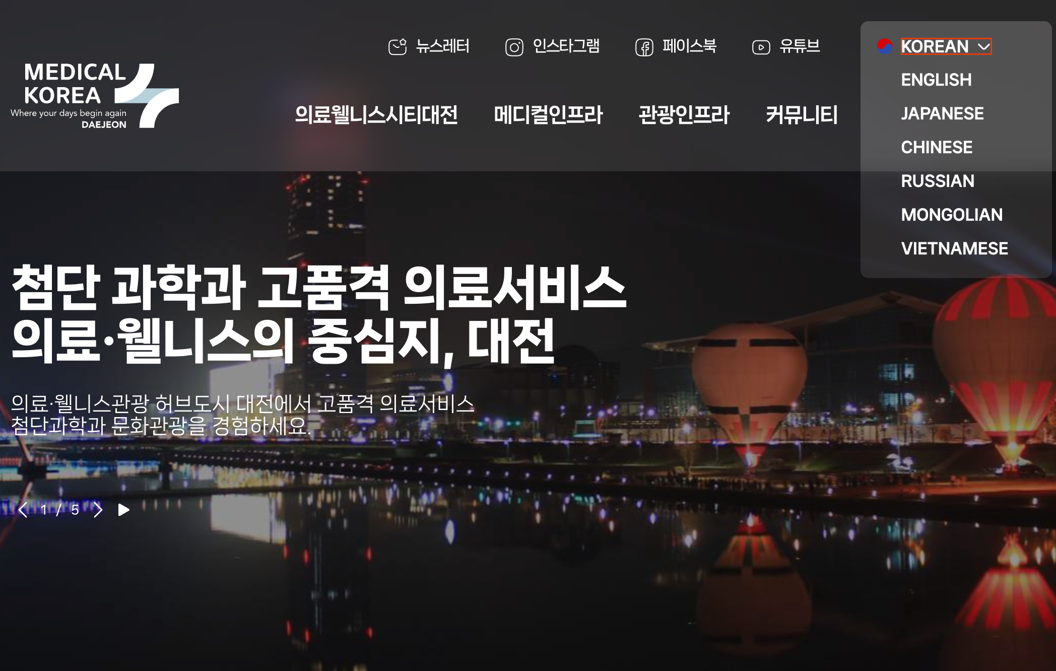 대전광역시는 이러한 자원을 활용하기 위해 2011년 부터 '의료웰니스시티대전' 플랫폼을 구축하였고, 2025년 6월 개편을 통해 인스타그램과 페이스북 등 SNS 채널을 본격 가동하며 대전의 의료 인프라를 전 세계에 알리고 있다. 하지만 여기서 한 가지 전략적 보완점이 발견된다. 공식 홈페이지는 다국어(영어/일본어/중국어/러시아어/몽골어/베트남어)를 지원하지만, 실제 잠재 고객에게 도달하는 핵심 통로인 SNS 콘텐츠가 여전히 영어에 편중되어 있다는 사실이다. 2024년 기준 한국을 찾은 외국인 환자 비중 1위인 일본(약 44만 명)과 2위인 중국(약 26만 명) 시장을 고려할 때, 이들의 실질적인 방문을 이끌어낼 '바이럴 파이프라인'으로서 해당 언어권에 맞춘 SNS 콘텐츠 접근성 재고가 시급하다.