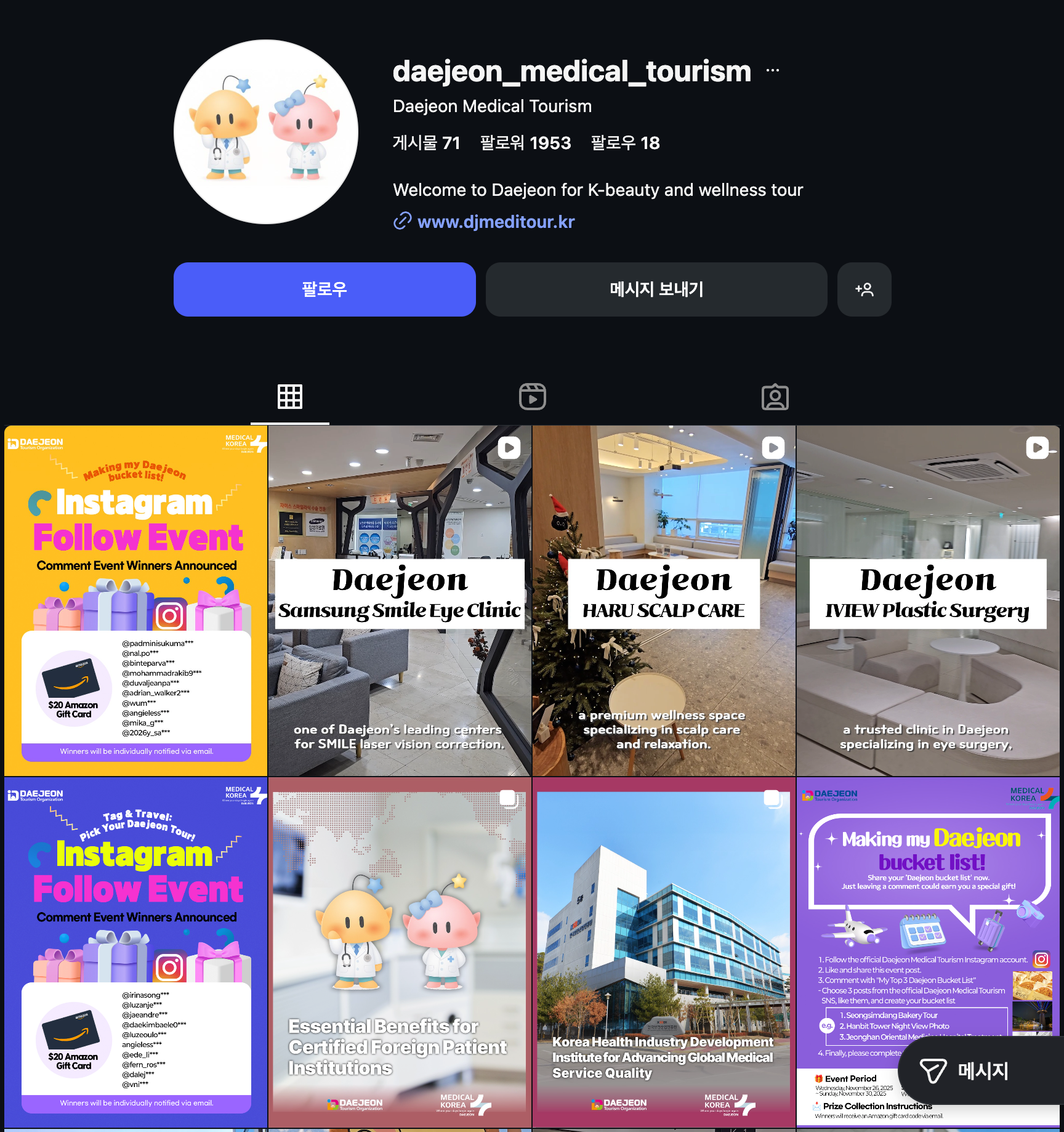 <출처: [좌]대전 메디컬 투어(https://www.djmeditour.kr/ko/index.do), [우]대전 메디컬 투어 인스타그램(https://www.instagram.com/daejeon_medical_tourism/)>
