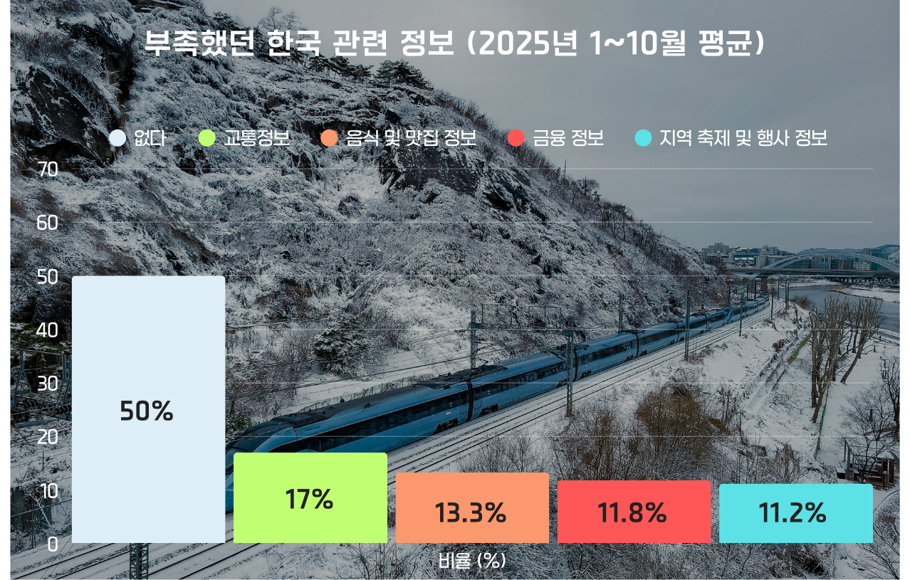 외국인들이 한국 여행에서 느끼는 갈증은 의외로 단순한 곳에서 시작된다. '2025 외래관광객 조사 3분기 잠정치 보고서(한국문화관광연구원)'에 따르면, 한국 여행 중 겪은 불편함 1위는 교통정보(16.5%)였다. 그 뒤를 이어 음식 및 맛집 정보(12.7%), 금융 정보(12.6%), 지역 축제 및 행사 정보(10.9%)가 순위에 올랐다. 주목할 점은 불편함이 '없다'고 답한 비율이 50.1%로 과반을 넘었다는 사실이다. 하지만 이를 정보의 충분함으로 해석하기엔 이르다. 이는 대다수 외국인의 최종 목적지가 정보 접근성이 압도적으로 높은 '서울'에 집중되어 있기 때문에 발생하는 통계적 착시일 가능성이 크다.