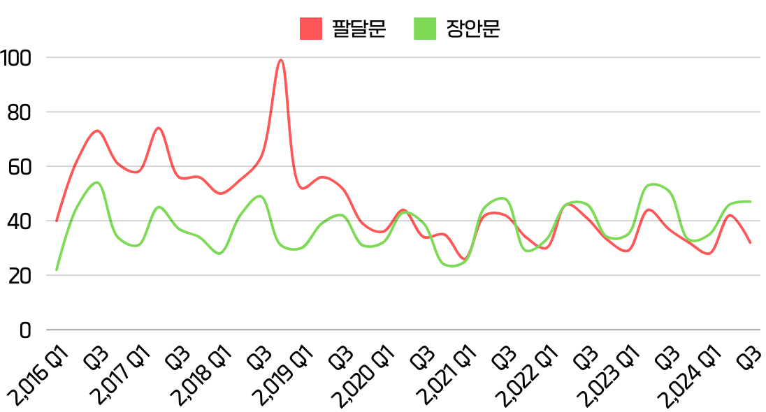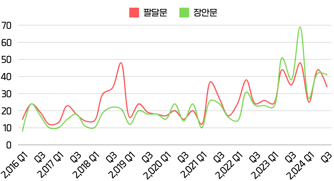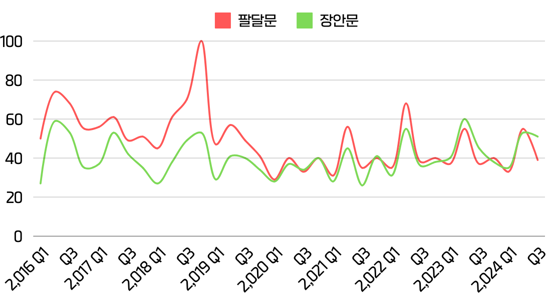 전체 데이터를 먼저 들여다보자. 최근 몇 년간 장안문의 검색량은 꾸준히 상승세를 보이며 팔달문을 앞지르고 있다. 이는 행궁동 일대가 젊은 세대의 새로운 문화 공간으로 주목받으면서 나타난 자연스러운 현상이다. 카페와 식당, 포토존이 늘어나고, SNS에서 장안문 일대가 '핫플레이스'로 자리잡으면서 상승세는 더욱 가파르다.