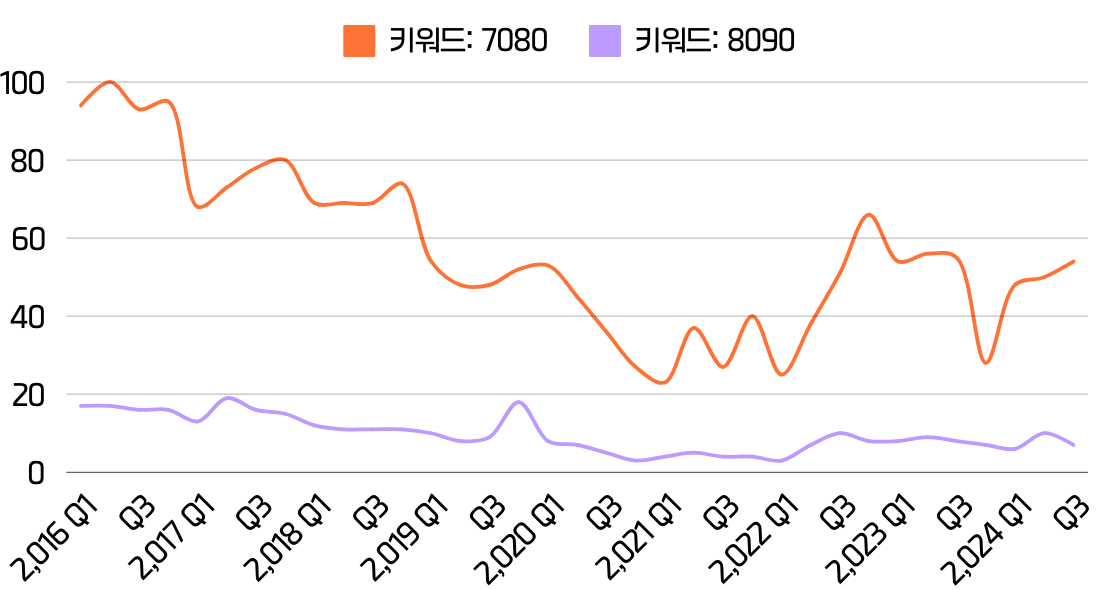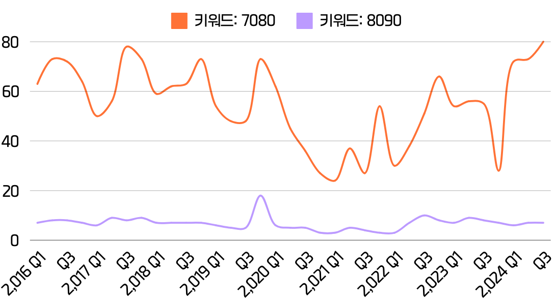 이러한 7080 키워드의 검색 트렌드는 중장년층이 단순히 과거를 회상하는 데 그치지 않고, 디지털 환경에서도 이 문화를 재소비하고 있음을 보여준다. 이는 중장년층이 과거의 문화를 디지털 콘텐츠를 통해 경험하며, 동시에 레트로나 뉴트로와 같은 방식으로 이를 새롭게 재해석하려는 욕구를 가지고 있음을 암시한다.