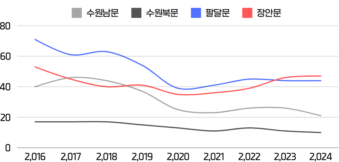 이러한 경향은 2030세대의 데이터에서 더욱 명확하게 드러난다. 두 번째 그래프가 보여주듯, 젊은 세대에게 장안문은 '지금' 가장 매력적인 공간이다. 반면 팔달문에 대한 관심은 지속적으로 하락하고 있다. 이들에게 팔달문은 '부모님 세대의 공간'으로 인식되는 듯하다. 젊은이들의 발걸음이 점점 더 장안문 쪽으로 향하면서, 이러한 격차는 더욱 벌어지고 있다.