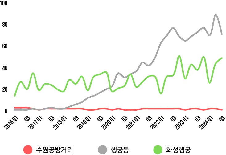 공방거리는 최근 몇 년 간 주말마다 북적이는 모습을 보여주고 있지만, 온라인에서의 관심도는 다소 아쉬운 모습을 보이고 있다. 특히 '수원 공방거리'라는 키워드의 검색지수는 하락 추세를 보이고 있으며, 이는 주변 행궁동에 대한 관심이 급격히 증가하고 있는 것과 비교하면 더욱 두드러진다. 수원 공방거리는 화성행궁과 바로 인접해 있지만, 화성행궁에 대한 꾸준한 관심도에 비해 상대적으로 저조한 검색지수를 기록하고 있다.