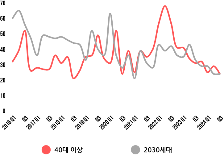 그러나 주목할 부분은 2023년 이후 40대 이상의 검색 지수 역시 감소하고 있다는 점이다. 이는 2016년에 30대였던 사람들이 현재 40대로 진입하면서, 이들의 관심도가 영향을 미쳤을 가능성이 크다. 2016년 당시 2030대의 관심이 급격히 줄어든 현상이 이제 40대 이상에서도 반복될 수 있다는 위기 신호로 볼 수 있다. 이러한 흐름을 방치한다면, 앞으로 40대 이상의 관심마저도 하락할 수 있다는 점에서 새로운 전략이 필요한 시점이다.