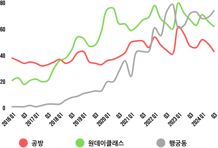 공방거리에 대한 2030세대의 관심이 줄어든 것일까? 이를 확인하기 위해 "공방"과 관련이 깊은 또 다른 키워드인 "원데이 클래스"의 검색 데이터를 비교해 보자. 흥미로운 점은 "공방" 키워드가 여전히 꾸준한 관심을 받고 있으며, "원데이 클래스"의 검색 지수는 2016년 이후 4배 이상 증가했다는 것이다. 이는 단순한 공예 체험을 넘어서, 공방에서 이뤄지는 활동에 대한 인식이 변화하고 있음을 시사한다.