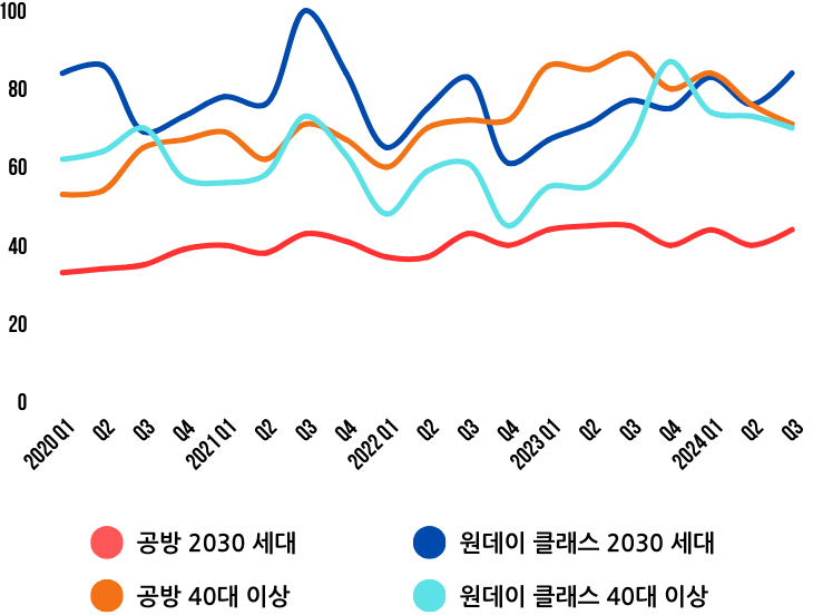 공방거리에 대한 관심이 단순히 줄어든 것일까? 연령대별 검색 데이터를 살펴보면, 이 하락의 주된 원인은 2030세대의 관심 감소에 있다. 2030세대의 검색 지수는 과거에 비해 크게 줄어든 반면, 40대 이상의 연령층은 꾸준한 관심을 보이고 있었다.