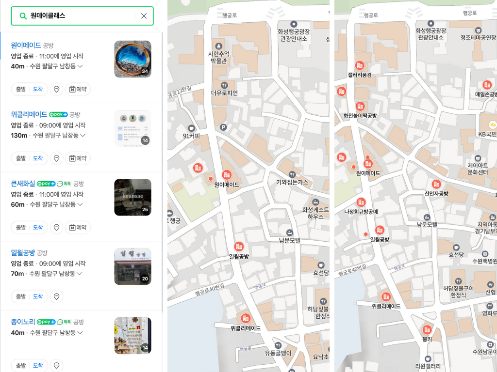 현재 수원 공방거리에는 15개의 공방이 네이버 플레이스에 등록되어 있으며, 그중 네이버 예약이 가능한 공방은 단 4곳에 불과하다. 원데이클래스를 제공하는 6개의 공방 중에서도 네이버 예약 시스템을 통해 실제로 체험을 예약할 수 있는 곳은 3곳에 그치고 있다. 이처럼 공방거리는 방문객이 오프라인에서 느끼는 매력에 비해 온라인 접근성이 크게 부족하다.
