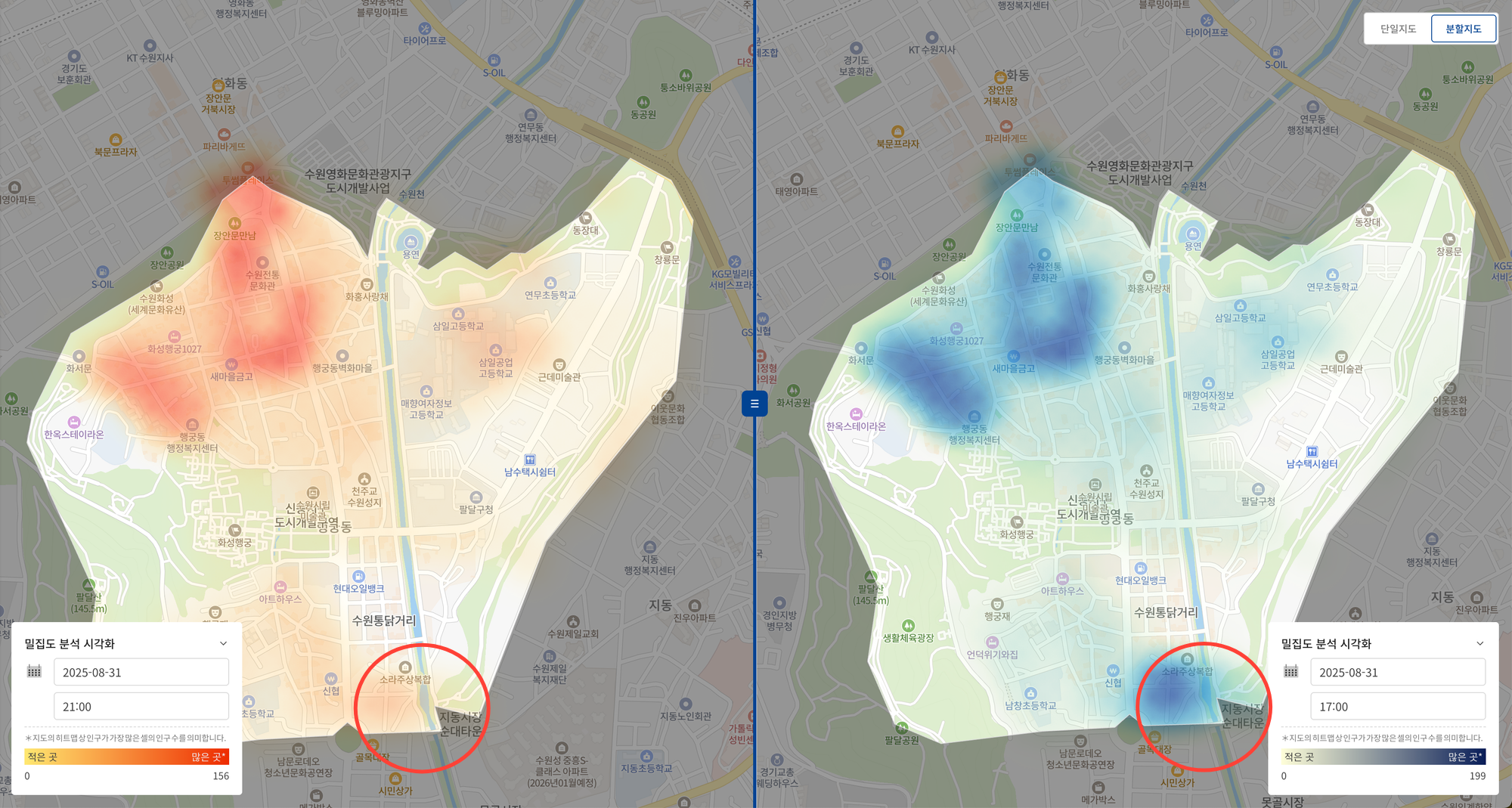 2025년 8월 31일 일요일 저녁의 행궁동 일대 인구 밀집도 데이터는 현재 상황과 기회를 동시에 보여준다. 초저녁인 17시(오른쪽 지도)에는 행궁동의 중심상권인 북쪽(장안문~화서문)과 남문시장이 위치한 남쪽_(팔달문) 모두에 활기가 확인된다. 하지만 밤이 깊어지는 21시(왼쪽 지도)가 되자, 북쪽의 ‘행궁동 중심상권’은 여전히 사람들로 붐비지만, 남문시장 주변은 저녁 시간에 인구 밀집도가 상대적으로 낮아지는 패턴을 보인다.