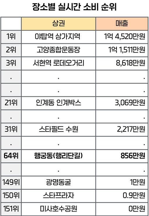 이런 거대한 리그 안에서 수원의 상권들은 어떤 위치를 차지하고 있을까? 같은 시간, 수원에서 가장 높은 순위를 기록한 곳은 21위의 인계동 인계박스(3,069만 원)다. 수원의 전통적인 상업 중심지로서 체면을 지켰지만, 경기도 전체로 보면 ‘최상위권’보다는 ‘상위권’에 가깝다. 모두의 관심을 한 몸에 받았던 스타필드 수원은 31위(2,217만 원)에 머물렀다. 그리고 행궁동은 한참이나 뒤처진 64위(856만 원)에 자리했다.