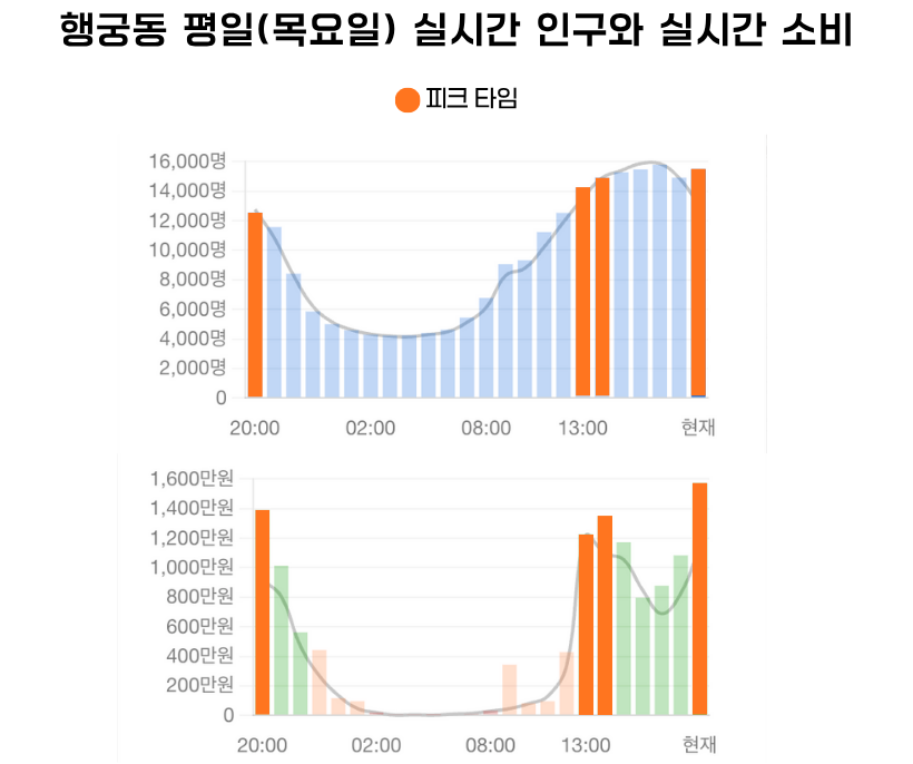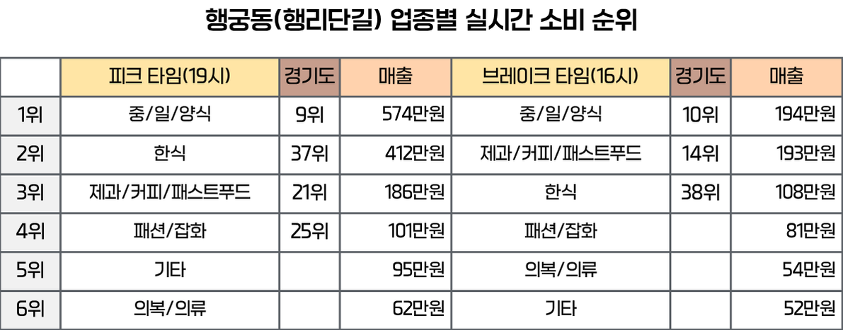 그렇다면 방문객들은 구체적으로 어디에, 어떻게 돈을 쓰고 있을까? 매출이 정점에 달하는 피크 타임과 바닥으로 떨어지는 브레이크 타임, 두 시간대의 업종별 소비 데이터를 통해 행궁동 상권의 내부를 들여다 보자.