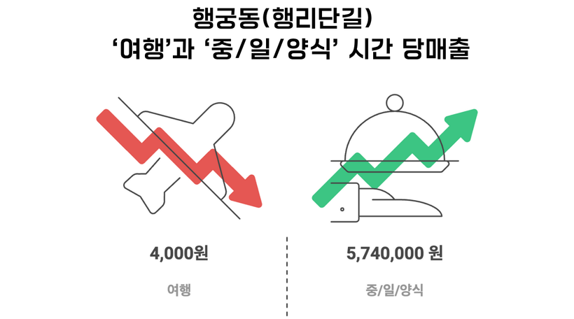 데이터를 더 깊이 들여다보면, 행궁동의 잠재력을 가늠할 수 있는 지표들이 발견된다. 식사와 카페 외의 즐길 거리를 의미하는 ‘스포츠/문화/레저(47만원)’ 업종은 ‘편의점(49만원)’보다도 낮은 매출을 기록했다. 눈에 띄게 늘어난 외국인 관광객에도 불구하고 외국인의 주요 소비품인 ‘화장품(16만 원)’과 ‘미용(7만 원)’ 업종의 시간당 매출은 존재감이 미미한 수준이다. 그리고 수원 대표 관광지라는 이름이 무색하게 민간 ‘여행’ 업종의 시간당 매출이 고작 4천 원에 불과하다는 사실은 충격적이기까지 하다.