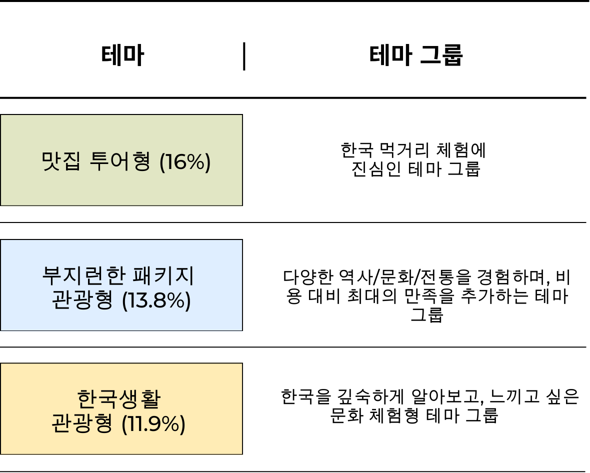 앞서 살펴본 ‘갈비(Galbi)’와 ‘치킨(Korean fried chicken)’에 대한 꾸준한 관심은, 이미 해외에서도 한국 음식 문화 전반에 대한 이해도가 높아졌음을 방증한다. 하지만 단순히 온라인 검색량이 늘었다는 것만으로는 효과적인 마케팅 전략을 세우기 어렵다. 실제로 해외 방문객들이 어떤 목적으로 한국을 찾는지, 그리고 그중에서도 K-Food에 대한 취향이 어떤식으로 나타나는지 좀 더 구체적으로 살펴보는 일이 중요하다.