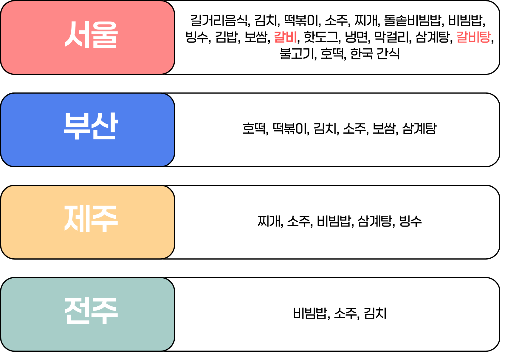 ‘지역별 관심도 및 메뉴판’ 데이터를 보면 아직 수원이 다른 도시만큼 뚜렷한 존재감을 보이진 않는다는 점에서, 몇 가지 해결 과제가 눈에 띈다. 예를 들어, “서울”은 길거리음식·김치·떡볶이·소주·비빔밥 등 이미 잘 알려진 메뉴들이 즐비하고, “전주” 하면 자연스럽게 비빔밥이 떠오르며, “부산”은 호떡, “제주”는 빙수·찌개 등 나름의 연상되는 음식의 이미지가 분명히 자리 잡고 있다. 반면, 수원은 갈비나 치킨에 대한 언급이 간간이 드러나긴 하지만, 타 도시처럼 유의미한 데이터로서 메뉴와 지역이 자연스럽게 결합되는 단계까지는 아직 미치지 못하는 형국이다.