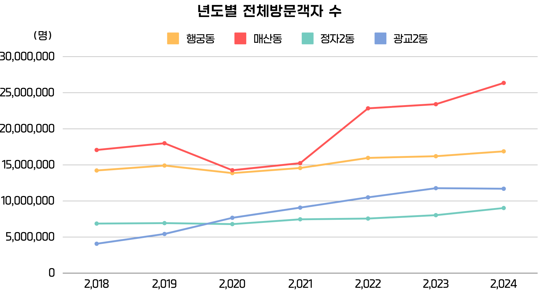수원에서 방문객이 가장 많은 곳은 단연 매산동(수원역 인근)이다. 2024년 기준으로 연간 약 2,500만 명 이상이 오가는 것으로 집계되지만, 이 중 상당수는 지하철과 버스를 환승하거나, 다른 곳으로 이동하기 전 잠시 들르는 유동인구 비중이 크다. 반면 행궁동·광교2동·정자2동은 연간 총 방문객 규모가 매산동만큼 압도적이진 않아도, 각각 고유의 색깔과 상권 성격을 갖추며 점차 성장곡선을 그리고 있다는 점이 더 흥미롭다.