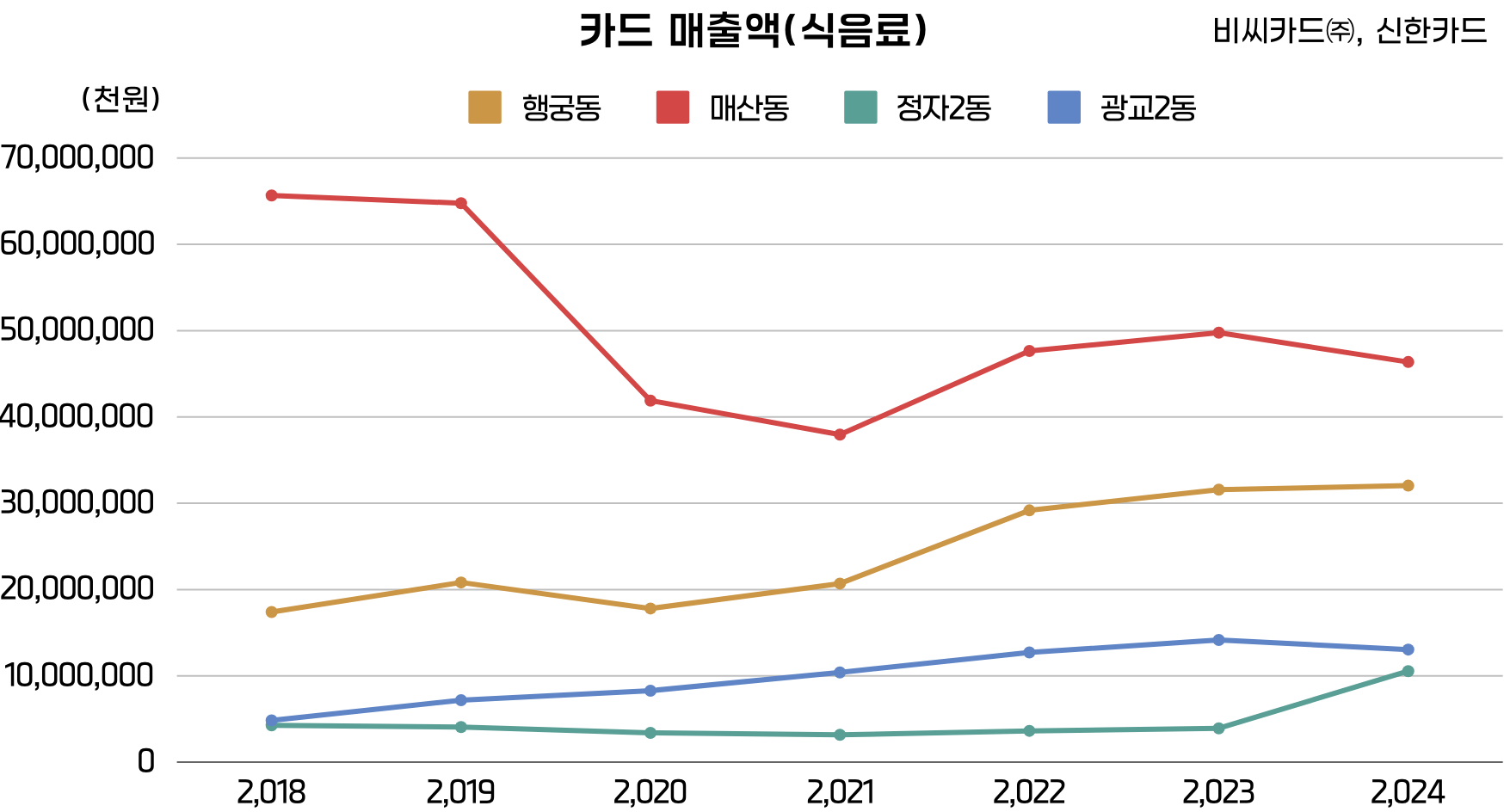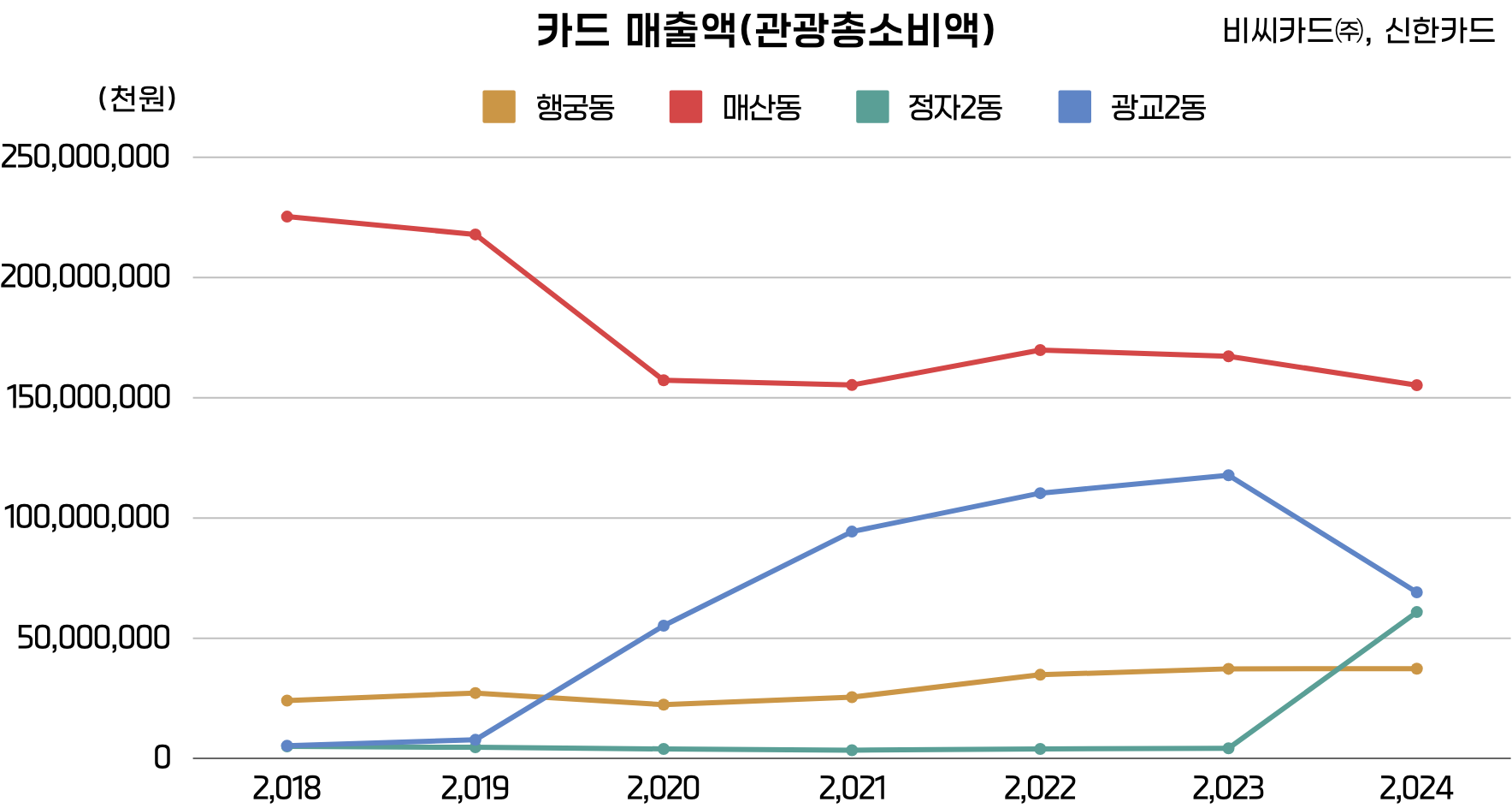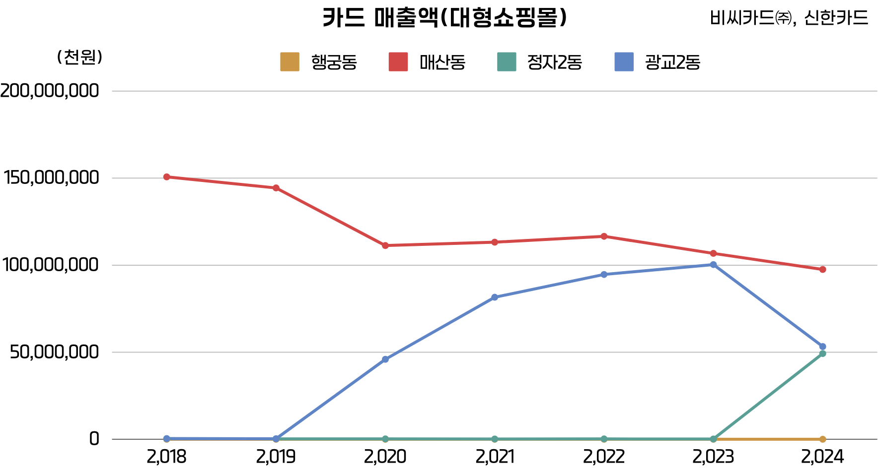 행궁동은 성곽으로 둘러싸여 로컬 골목의 매력을 전면에 내세운 상권이다. 이에 반해 광교2동(G쇼핑몰)과 정자2동(S쇼핑몰)은 한 건물 안에서 쇼핑·엔터테인먼트를 모두 해결할 수 있는 편리함을 강점으로 빠르게 유동인구를 끌어모으며, 수원 내부뿐 아니라 전국적으로도 큰 주목을 받았다. 대형 쇼핑몰의 추가 오픈으로 인한 로컬 상권의 침체에 대한 걱정과는 다르게 2023년 광교2동의 대형쇼핑몰 관련 카드매출액이 최대 1,000억 원 안팎까지 치솟았다가, 2024년 정자2동에 신규 S쇼핑몰이 문을 열면서 약 500억 원대로 떨어지는 모습이 관찰 되었다. 반면, 정자2동은 2023년까지 대형쇼핑몰이 없었기 때문에 관련 매출이 0원이었으나, 2024년에 약 500억 원을 기록해 대형쇼핑몰 간 경쟁으로 발생한 카니발라이제이션*(새로 동종의 가게/쇼핑몰/제품 등이, 이미 있던 매출을 빼앗아가는 현상)을 추측할 수 있다.
