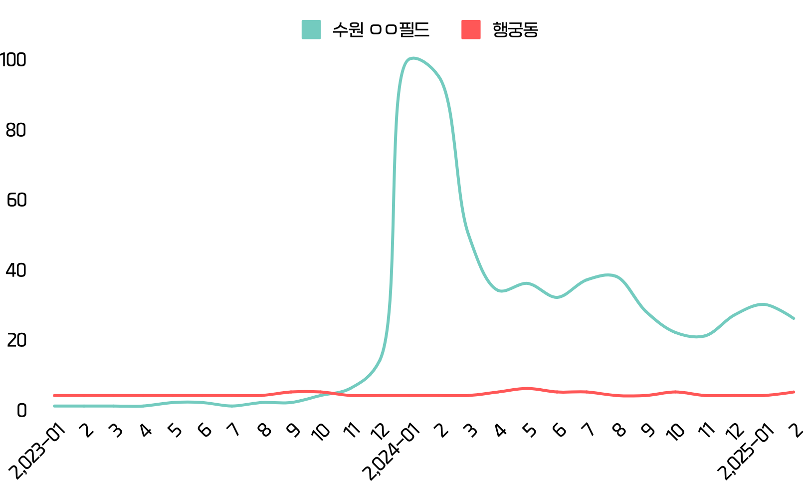더 나아가, 네이버 트렌드 등 전국 단위 데이터를 살펴보면 이러한 G쇼핑몰·S쇼핑몰의 급격한 성장과 방문객 증가가 수원 지역 전반을 향한 관심으로도 확장된다고 볼 수 있다. “수원○○필드” 키워드 관심도가 2024년을 전후해 눈에 띄게 상승하는데, 성수동과 키워드 파워가 비슷한 "행궁동"과 비교했을때 압도적인 차이를 만들어 냈다. 이 관심의 일부가 수원 내 다른 관광지에도 전이되면서, 행궁동처럼 역사의 숨결을 품은 골목 풍경과 다양한 로컬 체험을 즐기려는 이들도 조금씩 늘어나고 있다.