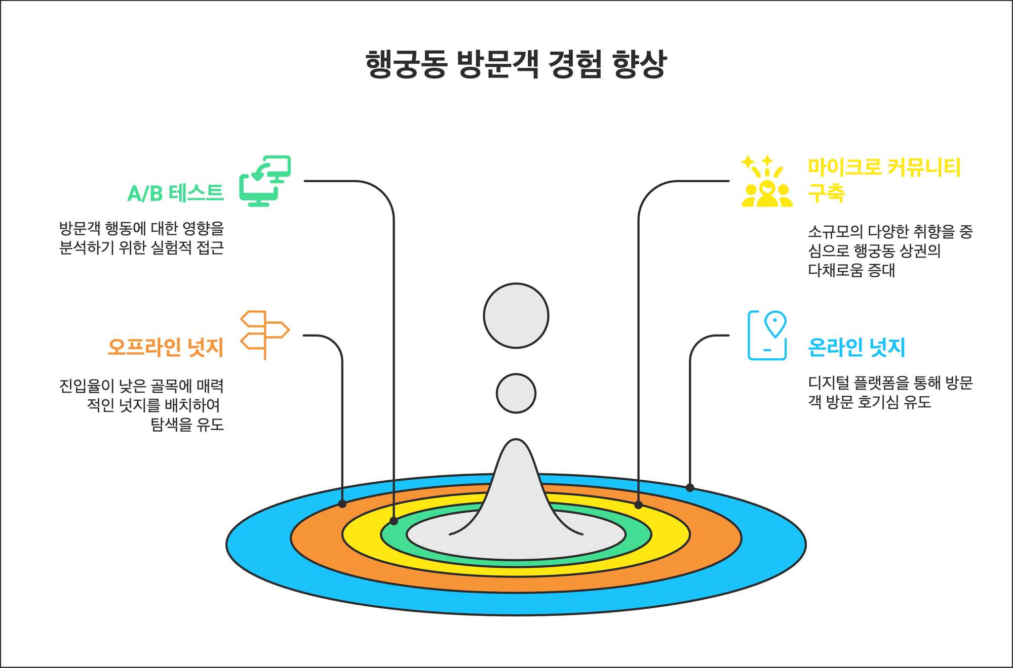 결과적으로, 행궁동 골목 상권이 펼쳐갈 미래는 온라인·오프라인을 아우르는 넛지와, 취향을 공유하는 행궁동 사람들을 지탱하는 마이크로 커뮤니티라는 두 축으로 그려질 수 있다. 이것들이 그저 이론적 구호에 그치지 않고 실제 매출과 방문객 재방문으로 이어지려면, 꾸준한 실험과 데이터 분석이 필수적이다. 보행 데이터와 매출 데이터를 함께 살펴 “소비자가 머무르는 지점”과 “취향 기반의 커뮤니티가 활성화되는 지점”을 교차 검토하면서, 작은 성공 사례를 하나씩 쌓아가는 길이 좋을 것이다. 경쟁하면서도 협력해야 한다는 말이 공허하지 않으려면, 대형쇼핑몰에서 찾아볼 수 없는 골목다운 가능성을 살리는 동시에, 혁신적인 실험정신을 더하는 구체적 실천이 뒤따라야 한다. 그리고 이때 골목 전체가 하나의 실험장이자 놀이터로 거듭난다면, 행궁동만의 유니크한 상권 모델이 탄생할지도 모른다.