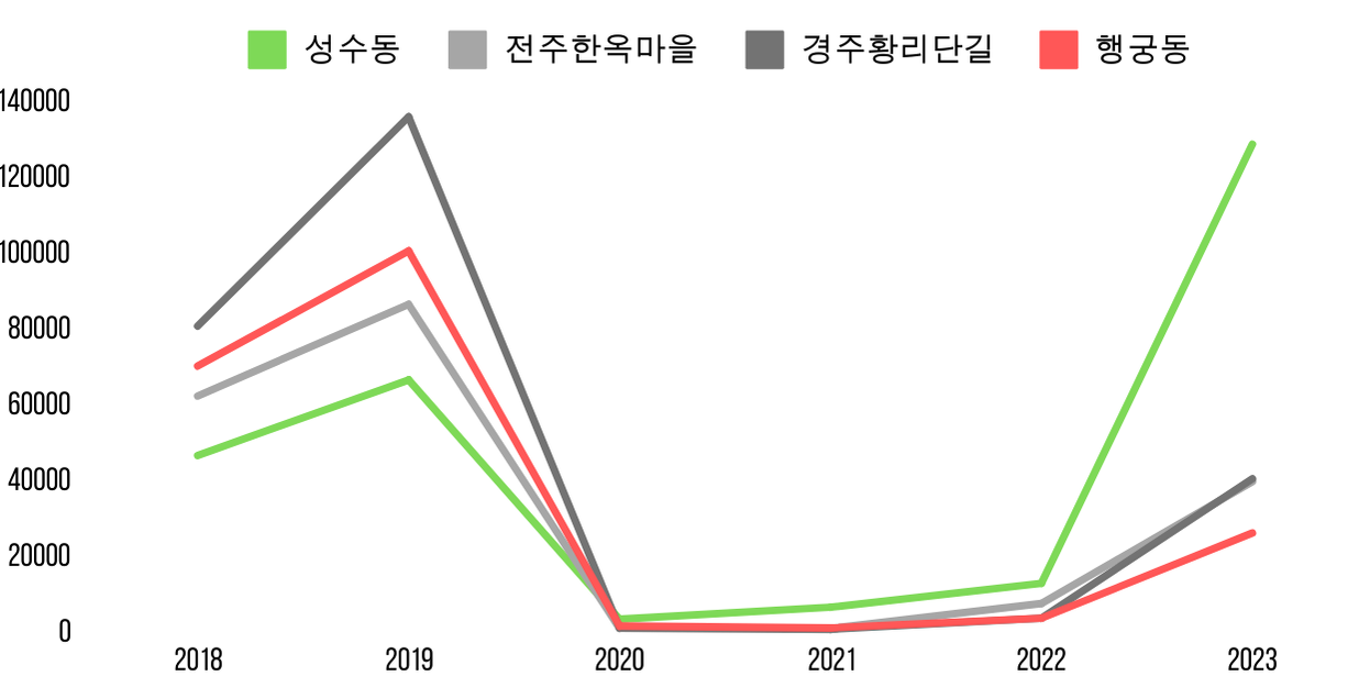 팬데믹 이후 국제 여행이 재개되면서 외국인 방문객 수는 서서히 회복되고 있다. 특히 K-팝과 K-드라마 등 K-컬처에 대한 전 세계적인 관심은 한국을 방문하고자 하는 외국인들의 수를 증가시키고 있다. 이러한 흐름은 행궁동에게도 새로운 기회를 제공할 수 있다. 하지만 현재 행궁동이 외국인 방문객들에게 얼마나 매력적으로 다가가고 있는지 살펴보면, 아직 많은 과제가 남아 있다. 전주 한옥마을이나 경주 황리단길과 같은 전통 명소들은 여전히 많은 사랑을 받고 있으며, 최근 성수동은 MZ세대 여성들의 관심을 끌며 외국인 방문객이 급증했다.