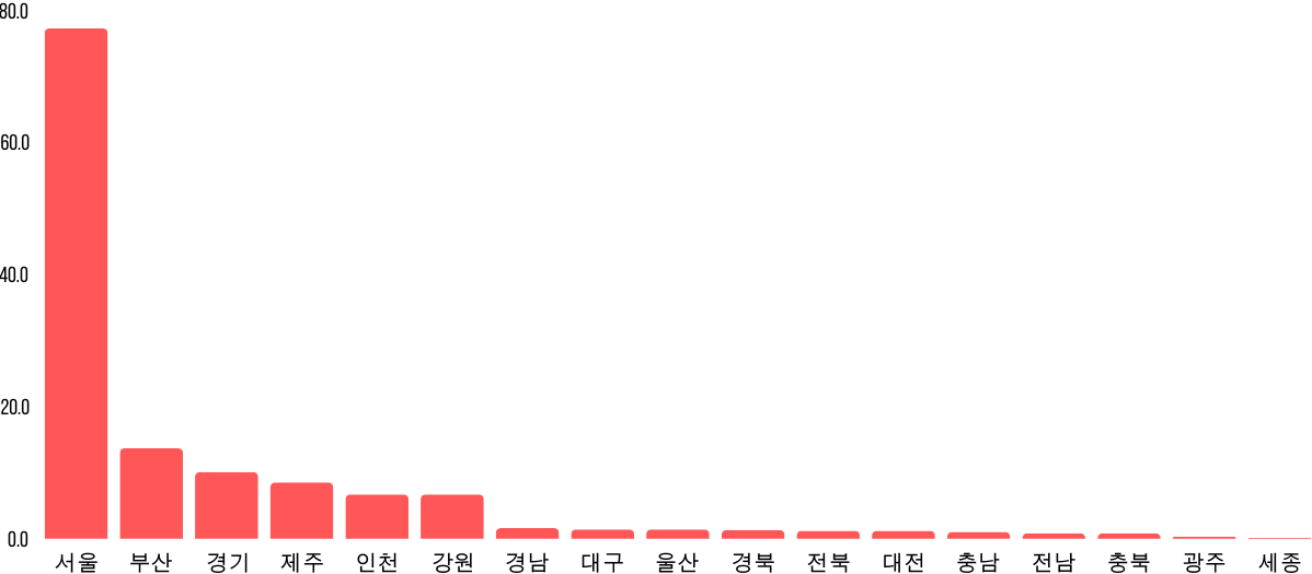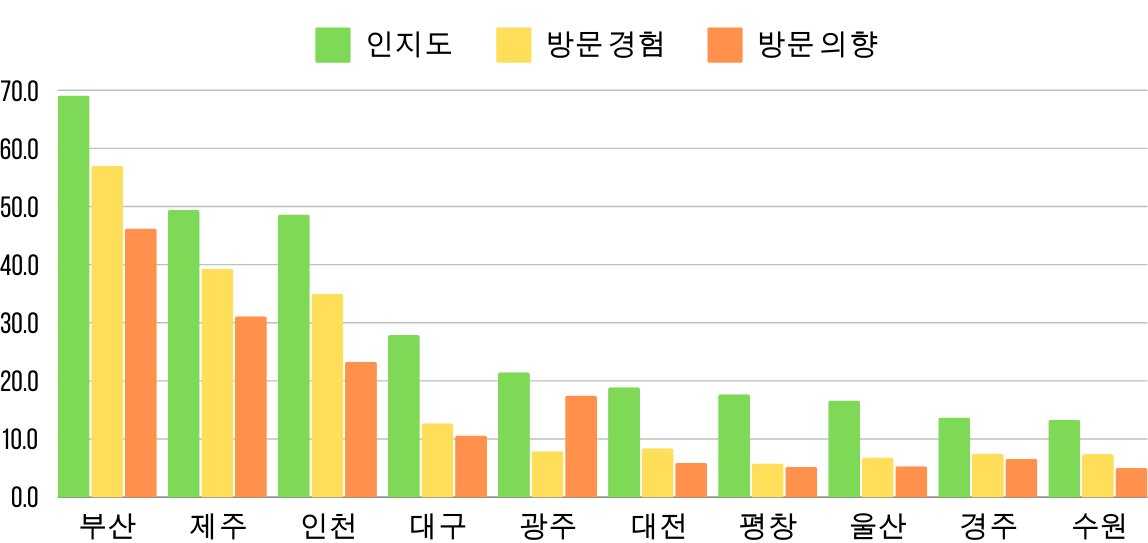 통계를 보면 외국인 방문객들의 첫 방문지로 대부분 서울이 선택되며, 그중 상당수는 서울만 방문하는 경향이 있다. 서울 외의 도시는 상대적으로 인지도가 낮아 주목 받지 못하는 상황이다. 서울을 제외한 도시 중에서는 부산(69.1%), 제주(49.4%), 인천(48.6%)이 인지도가 높지만, 그 사이에 수원(13.3%)도 외국인 방문객이 찾는 상위 10대 도시 안에 자리 잡고 있다.