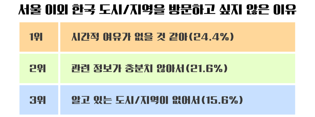 하지만 이들의 방문을 가로막는 주된 이유는 시간적 여유와 정보의 부족이다. 서울을 여행하고 남는 촉박한 일정으로 서울 외의 지역을 여행하는 것에 부담을 느낀다. 마음이 있어도 다른 지역에 대한 정보가 충분치 않아서, 여행 계획을 세우기 어렵다는 점이 방문객들에게 큰 장애물로 작용하고 있다. 이런 점은 수원의 위기이자 기회다. 수원은 서울에서 1시간 거리로 시간이 부족한 외국인 방문객들에게 부담없이 당일 여행을 할 수 있는 곳이다. 서울 이외의 도시나 지역의 정보를 원하는 외국인 방문객들에게 수원의 콘텐츠를 전달하기만 하면 된다.