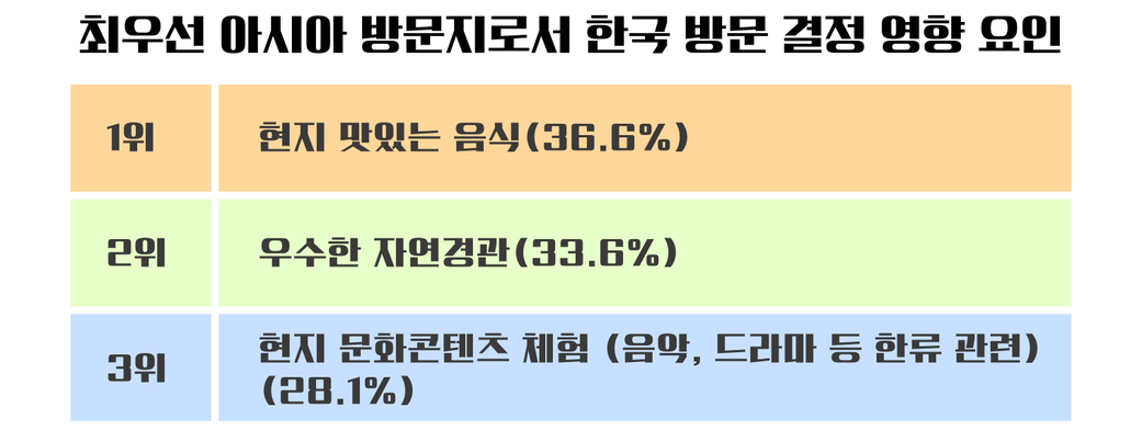 외국인 방문객들이 선호하는 주요 키워드인 미식, 자연경관, 문화 콘텐츠는 수원이 강력하게 내세울 수 있는 자원들이다. 수원은 전통 음식점과 트렌디한 레스토랑을 아우르는 미식 여행지로서의 가능성을 가지고 있으며, 수원의 도심 속 자연과 현대적 감각을 결합한 콘텐츠는 외국인 방문객들에게 새로운 경험을 제공할 수 있다. 최근에는 "그해 우리는", "이상한 변호사 우영우", "선재 업고 튀어" 등 다양한 K-드라마의 촬영지로도 각광 받고 있다. 수원의 다층적 자원을 기반으로, 각 세대와 관심사에 맞는 큐레이션된 콘텐츠를 제공하는 것이 가능하다.
