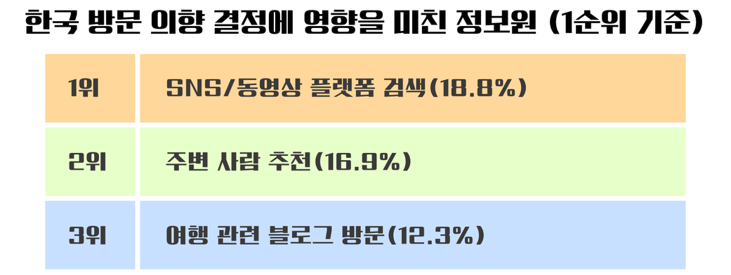 그러기 위해서 외국인 방문객들이 여행 정보를 주로 얻는 SNS와 디지털 플랫폼을 적극적으로 활용하는 전략이 필수적이다. 특히 유튜브, 페이스북, 인스타그램, 틱톡과 같은 글로벌 플랫폼뿐만 아니라, 抖音(도우인, 27.7%), 哔哩哔哩(빌리빌리, 12.7%), 小红书(샤오홍슈, 9.2%) 등 중국인 방문객들이 주로 사용하는 플랫폼을 적극 활용해야 한다. 현재 중국인 방문객이 한국을 방문하는 외국인 중 가장 많은 비중을 차지하고 있기 때문에, 이들을 대상으로 한 맞춤형 플랫폼 전략도 놓치면 안된다.