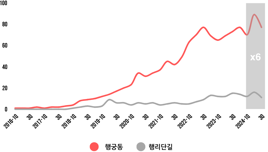 2024년 행궁동의 평균 검색지수는 70이며, 행리단길의 검색지수 11과 비교했을 때 약 6배 높은 수준을 보였습니다. 데이터의 추세로 볼 때, 이 현상은 더 가속화 될것으로 보인다.