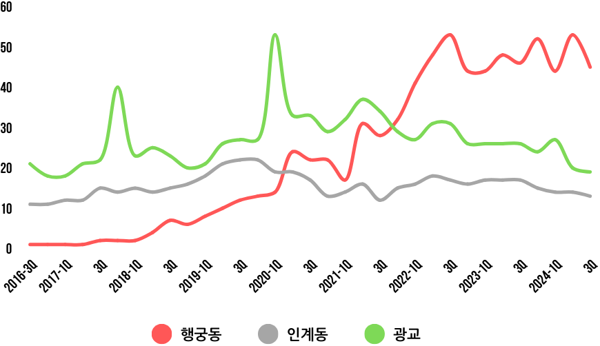 처음엔 일부 사람들이 행궁동을 ‘행리단길’이라고 부르기도 했지만, 실제로는 사람들이 행궁동이라는 이름을 훨씬 더 자주 사용했다. 이는 데이터에서도 명확하게 드러난다. 2016년을 기준으로 행궁동이라는 검색어가 행리단길에 비해 더 높은 검색 지수*를 기록하고 있었으며, 시간이 지날수록 그 차이는 더욱 벌어졌다.
