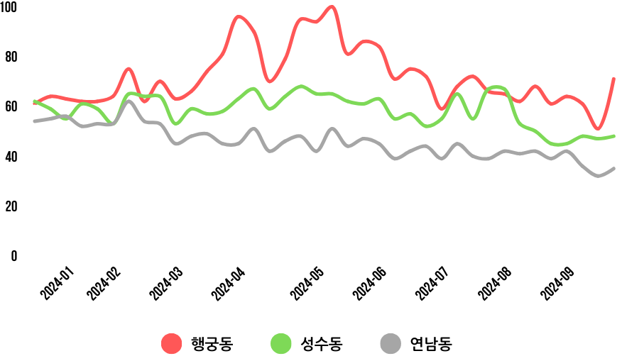 2024년 2월 데이터를 보면, 행궁동의 검색 지수는74로 성수동(65)과 연남동(61)을 넘어섰다. 특히 2024년 5월, 행궁동의 검색 지수는 최고치(100)를 기록하며 성수동-연남동과 큰 차이를 내기도 했다.